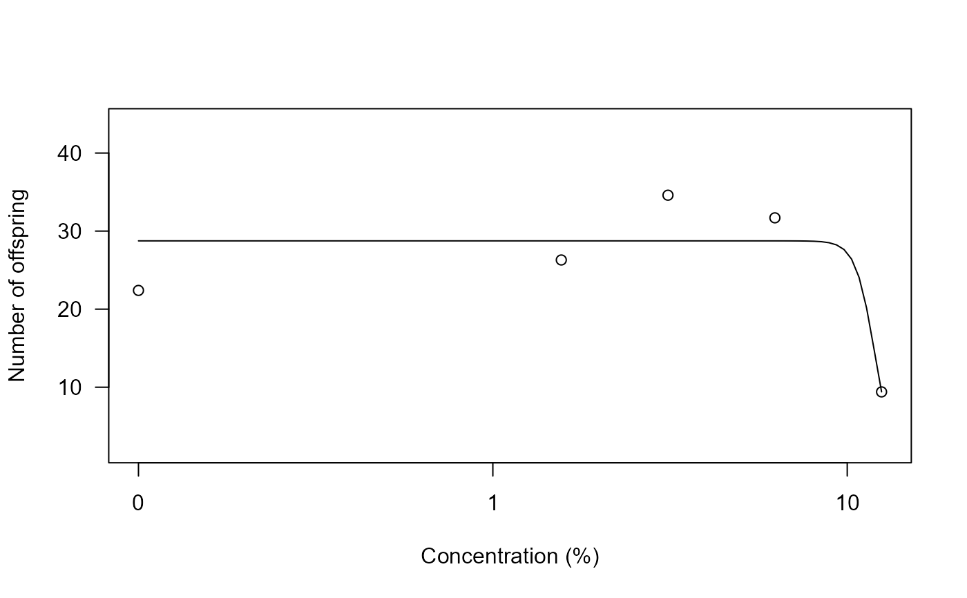 plot(C.dubia.m1, xlab = "Concentration (%)", ylab = "Number of offspring")