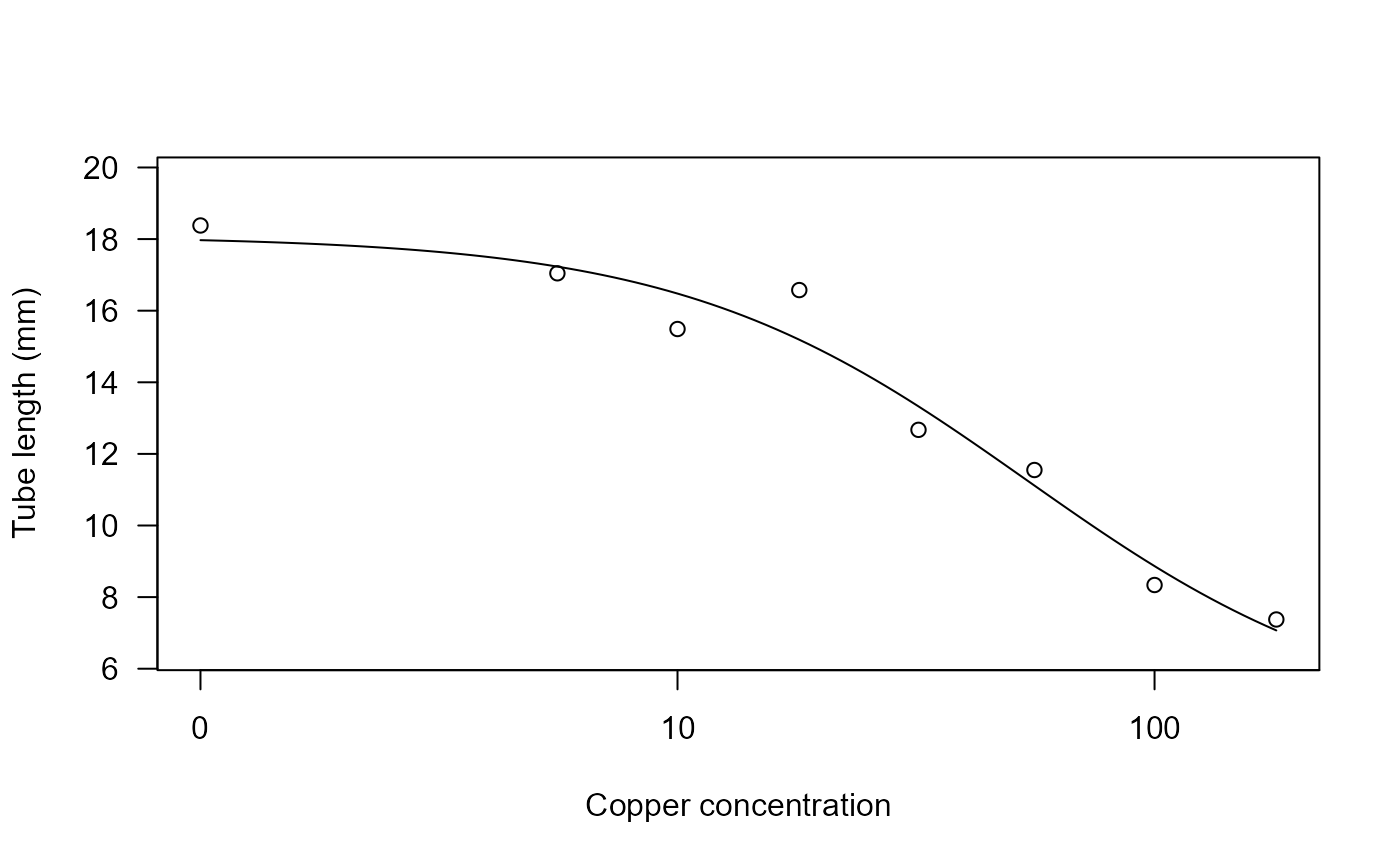 plot(GiantKelp.m1, xlab = "Copper concentration", ylab = "Tube length (mm)")