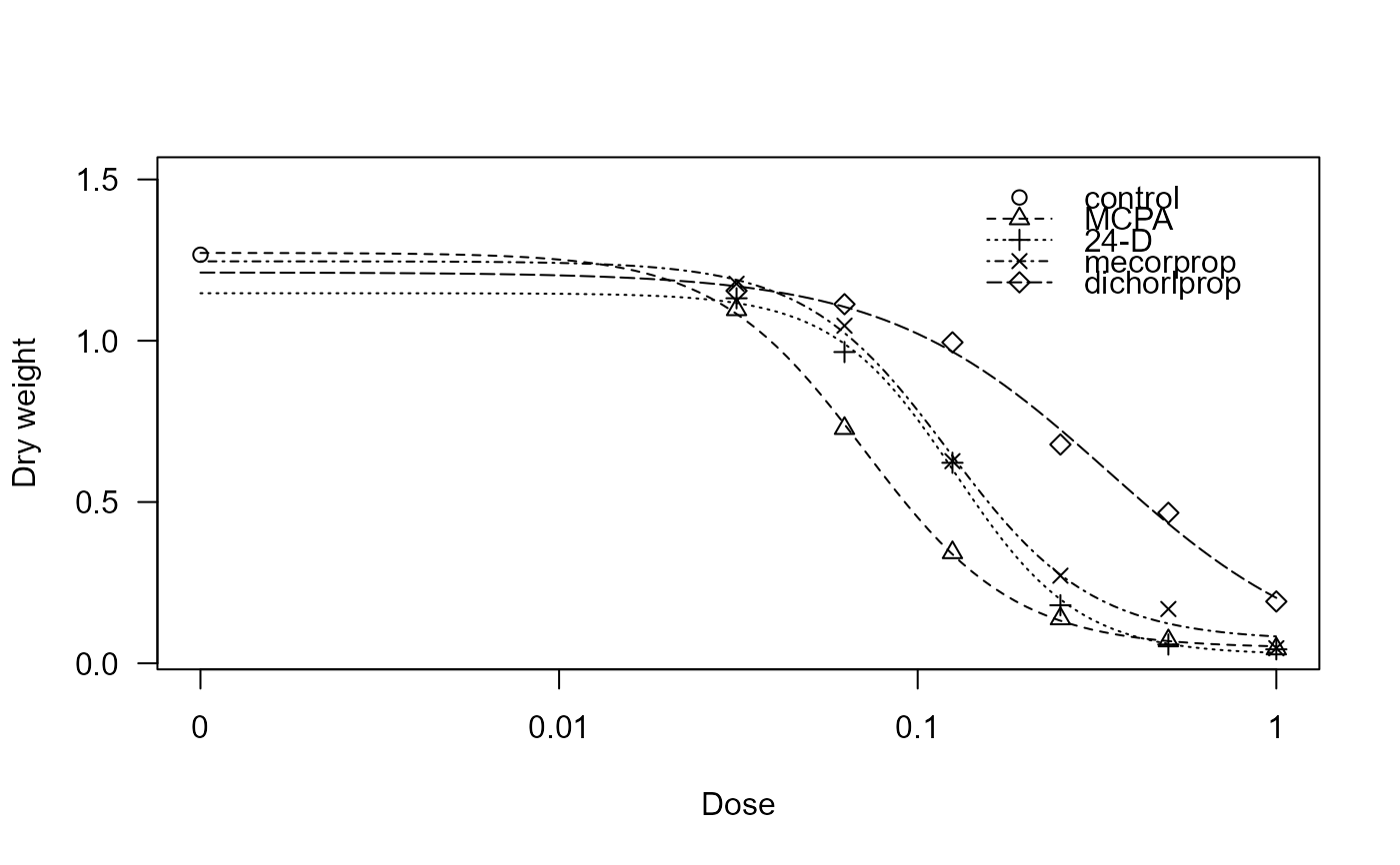 auxins.m1 <- drm(dryweight ~ dose, herbicide, data = auxins, fct = LL.4())