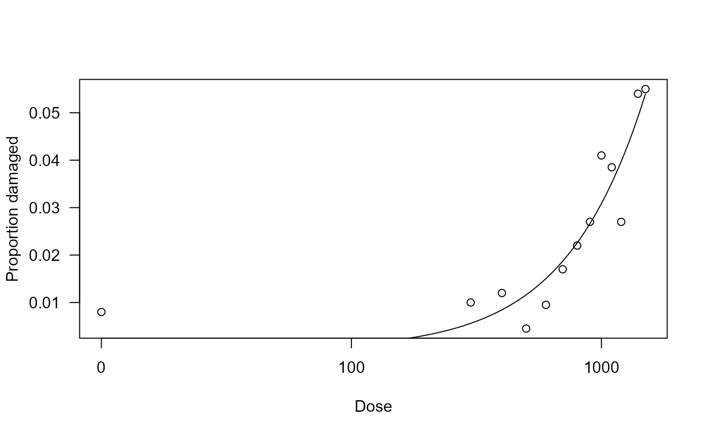 plot(carbendazim.m1, xlab = "Dose", ylab = "Proportion damaged")