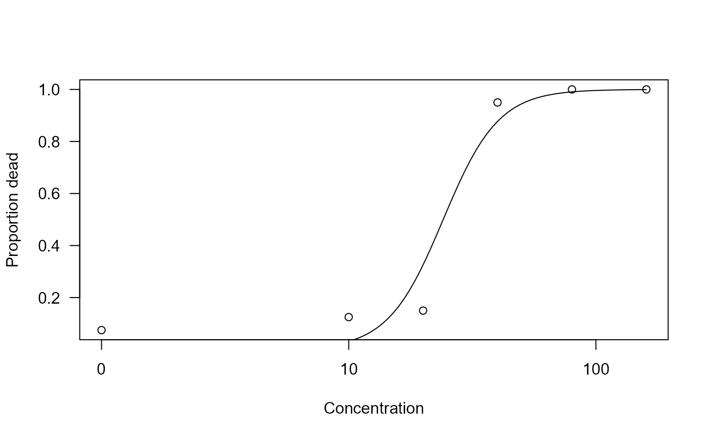 plot(chlorac.m1, xlab = "Concentration", ylab = "Proportion dead")