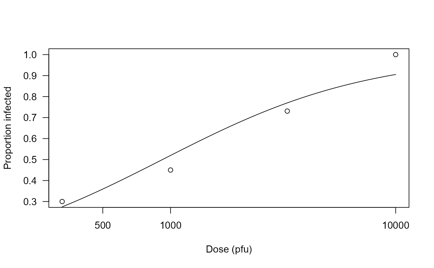 plot(echovirus.m1, xlab = "Dose (pfu)", ylab = "Proportion infected")