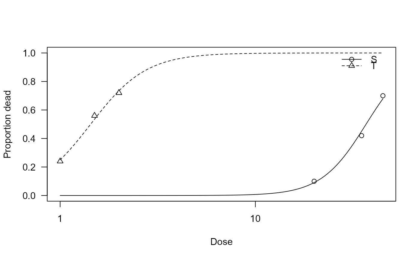 plot(guthion.m1, xlab = "Dose", ylab = "Proportion dead", ylim = c(0, 1))