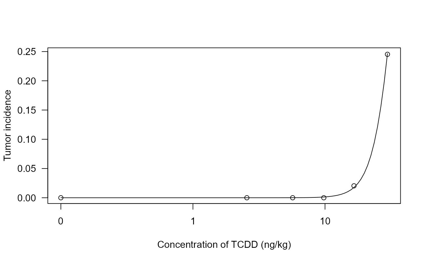 plot(liver.tumor.m1, xlab = "Concentration of TCDD (ng/kg)",