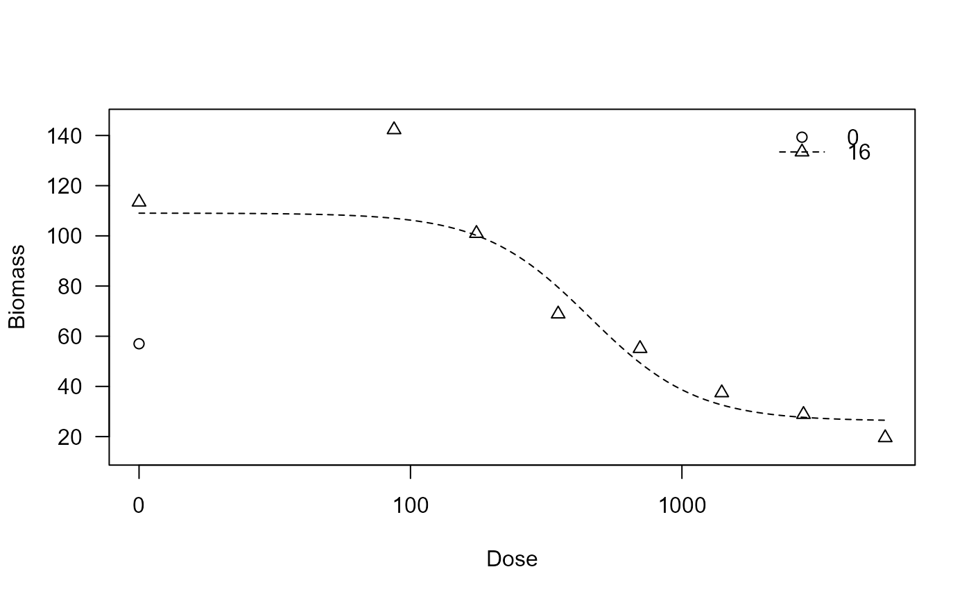 plot(red.fescue.m1, xlab = "Dose", ylab = "Biomass")