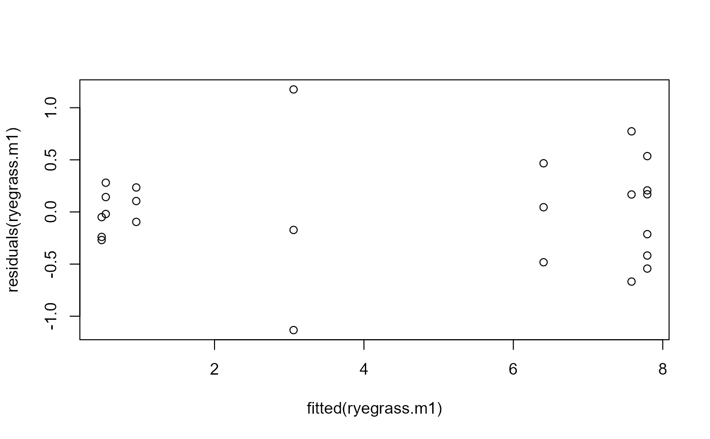 plot(fitted(ryegrass.m1), residuals(ryegrass.m1))