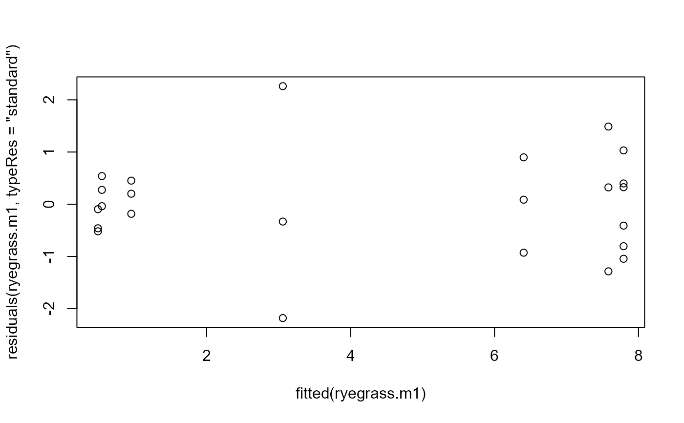 plot(fitted(ryegrass.m1), residuals(ryegrass.m1, typeRes = "standard"))
