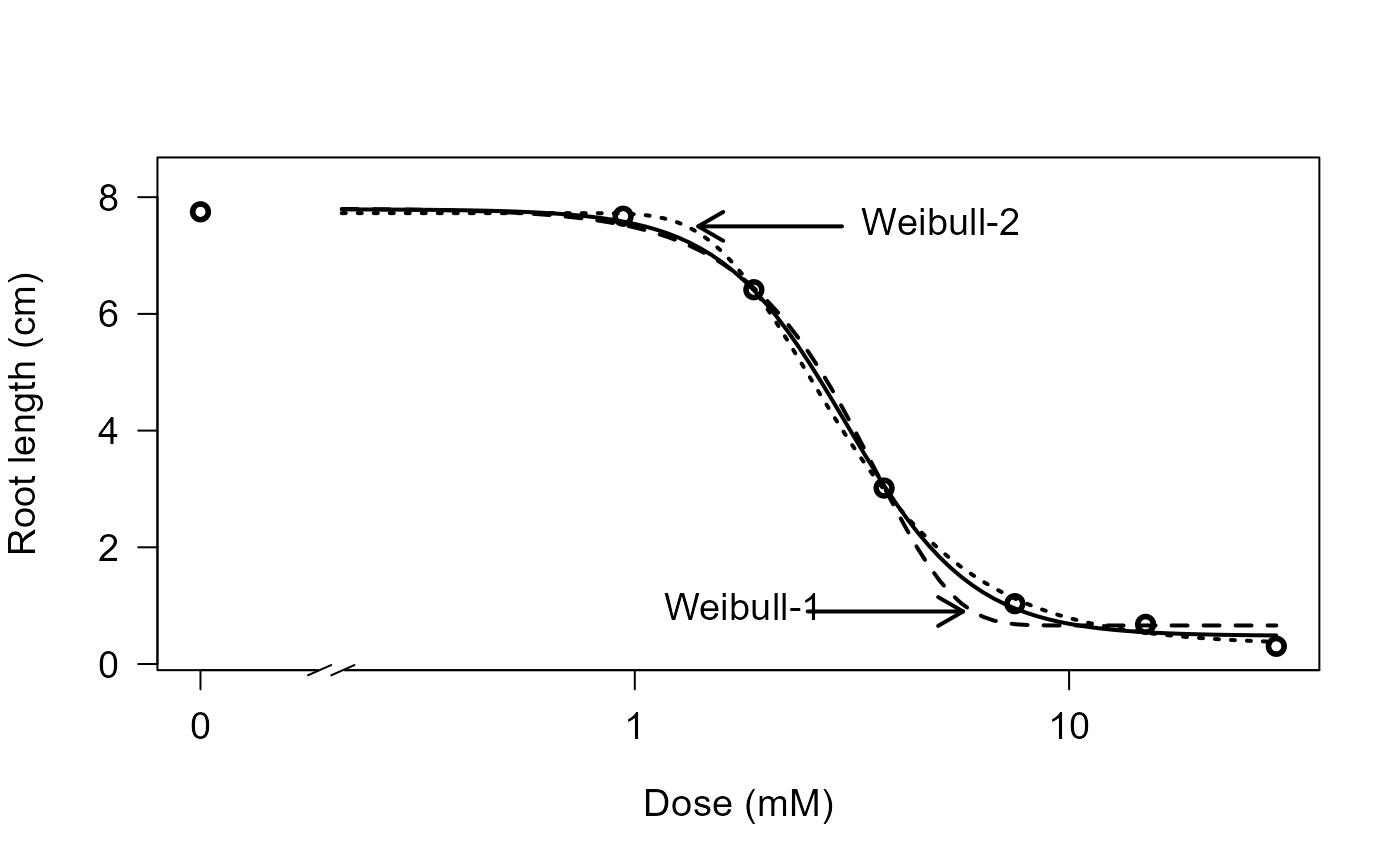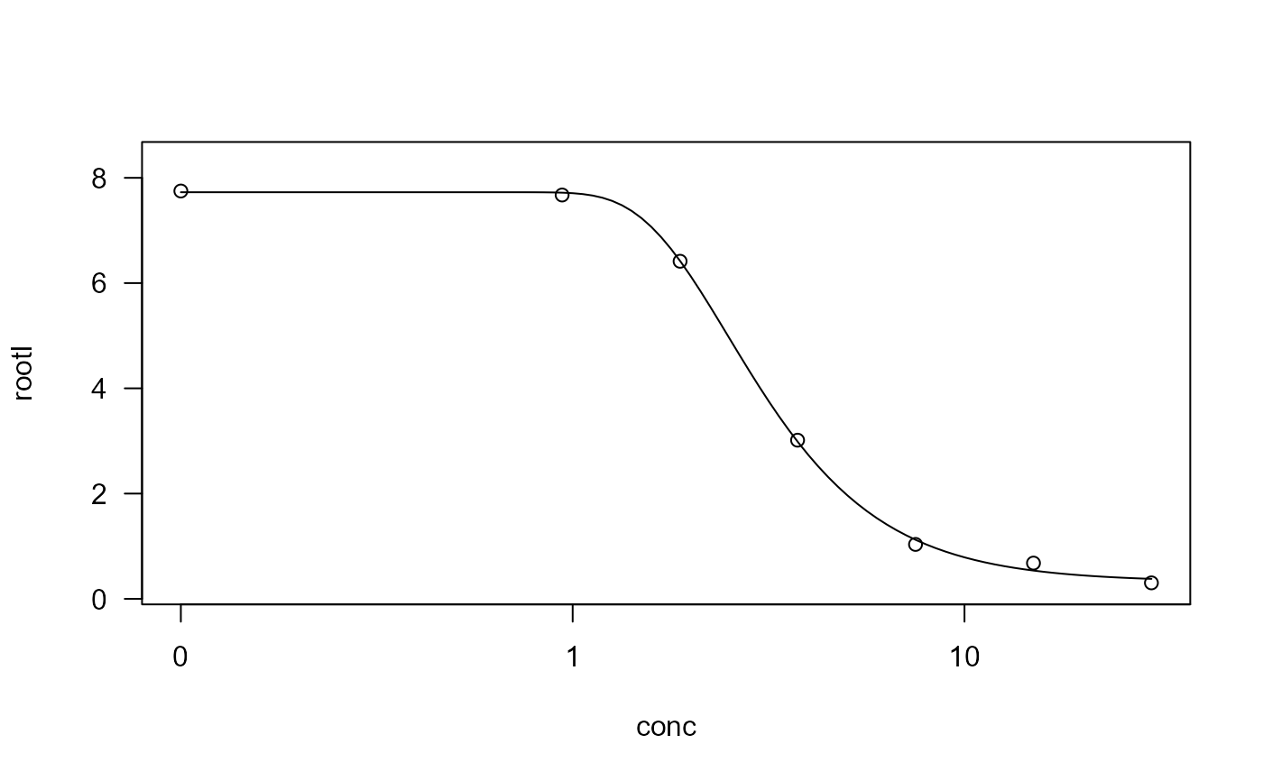 plot(ryegrass.m0, broken=TRUE, xlab="Dose (mM)", ylab="Root length (cm)", lwd=2,