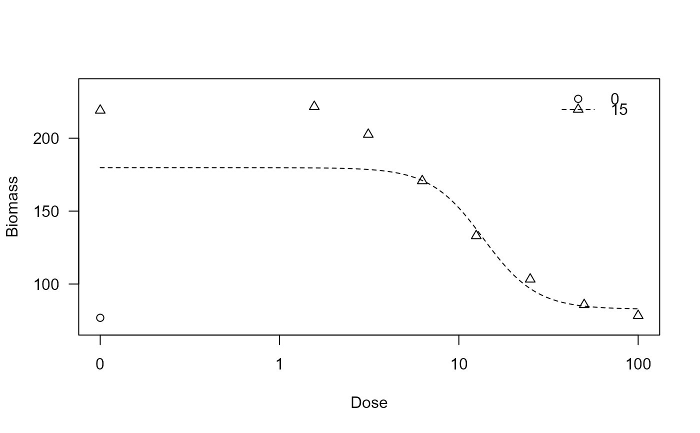 plot(ryegrass2.m1, xlab = "Dose", ylab = "Biomass")
